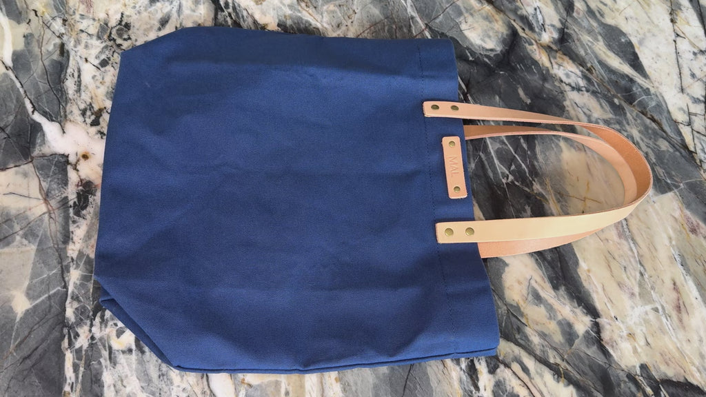 Introducing your new favorite Custom Market Tote! Crafted with pride in the USA using 100% cotton and sustainable leather, this durable tote is perfect for eco-conscious shoppers and style enthusiasts. Its spacious interior and sturdy handles are ideal for groceries, market finds, or beach essentials. It features an interior pouch and key snap to keep smaller items safe and accessible. Personalize it with up to three characters to make it truly one-of-a-kind. Give the gift of style, sustainability, and practicality! Dimensions 16.25" L x 5" W x 14.25" H, Handle Drop: 7.5", Interior Pocket: 8.6" x 5.5".
