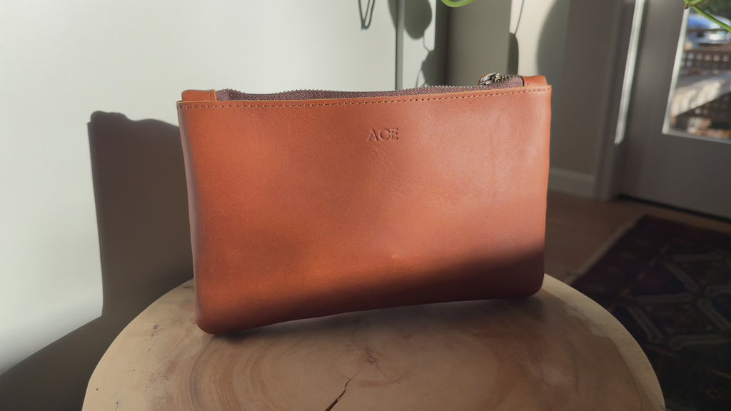 This USA-made, sustainable leather carrying case is your new favorite sidekick! It's perfect as a makeup bag, a simple clutch, or a handy catch-all for your tote or purse. Stay organized, look elegant, and keep things functional, no matter your style. Crafted with care in the USA from sustainable leather, you can personalize it with up to three characters, and add foil for an extra pop. It's a fantastic custom gift for anyone! Dimensions 10” x 6.38”