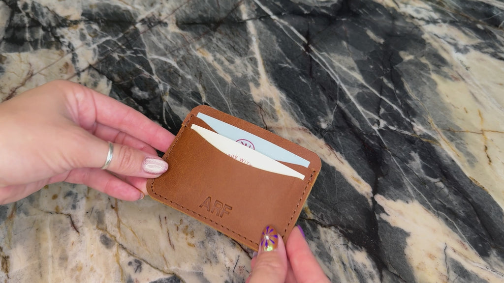This USA-made, sustainable, full-grain leather slim wallet is the perfect blend of style and functionality! Crafted with care in the USA, it offers a sleek way to carry up to 8 cards, with a convenient center pocket for cash. Personalize it with up to three characters, and add foil for that extra oomph! A thoughtful gift for yourself or someone special, this wallet is an everyday essential. Dimensions 4”L x 3”W